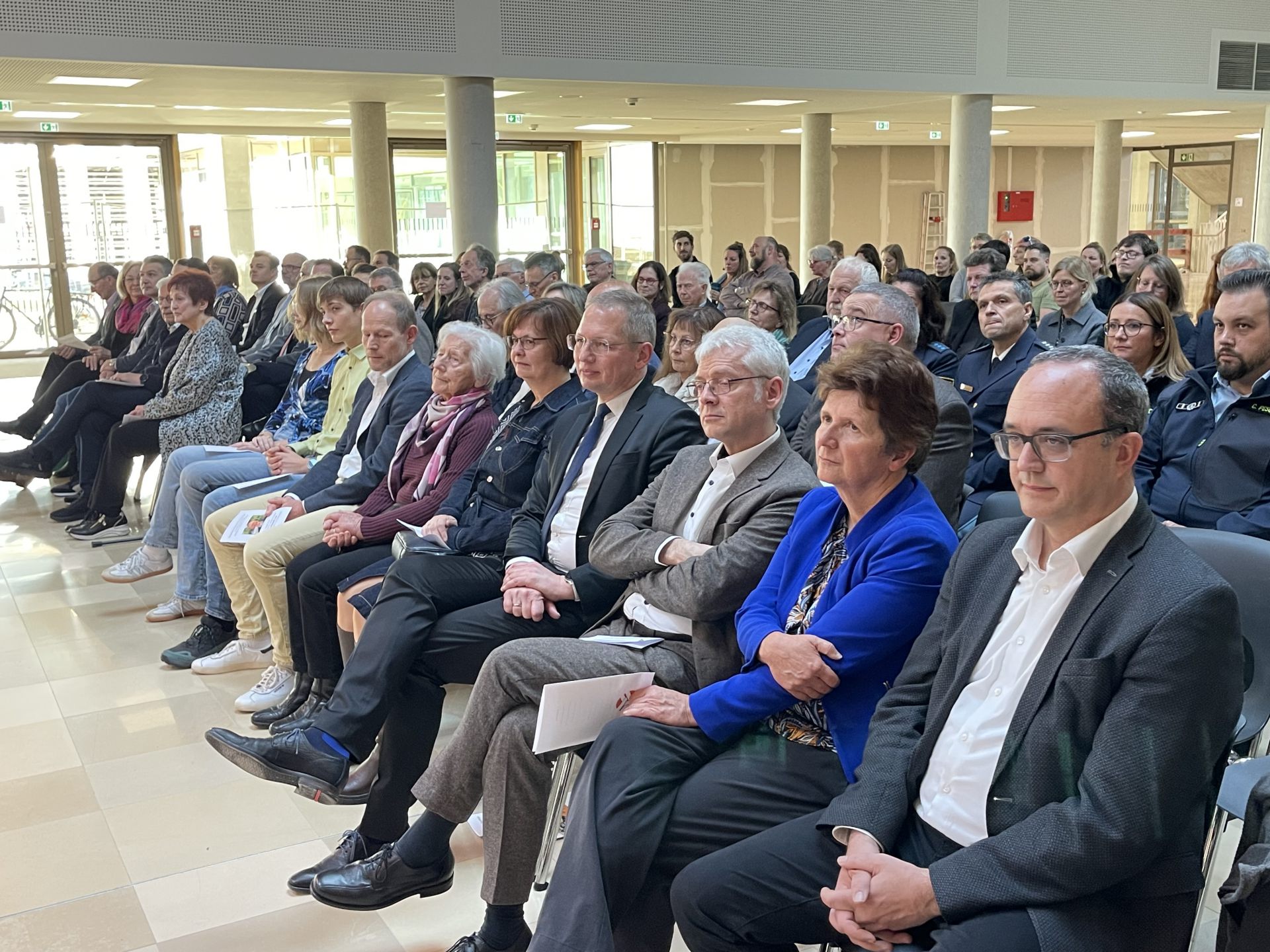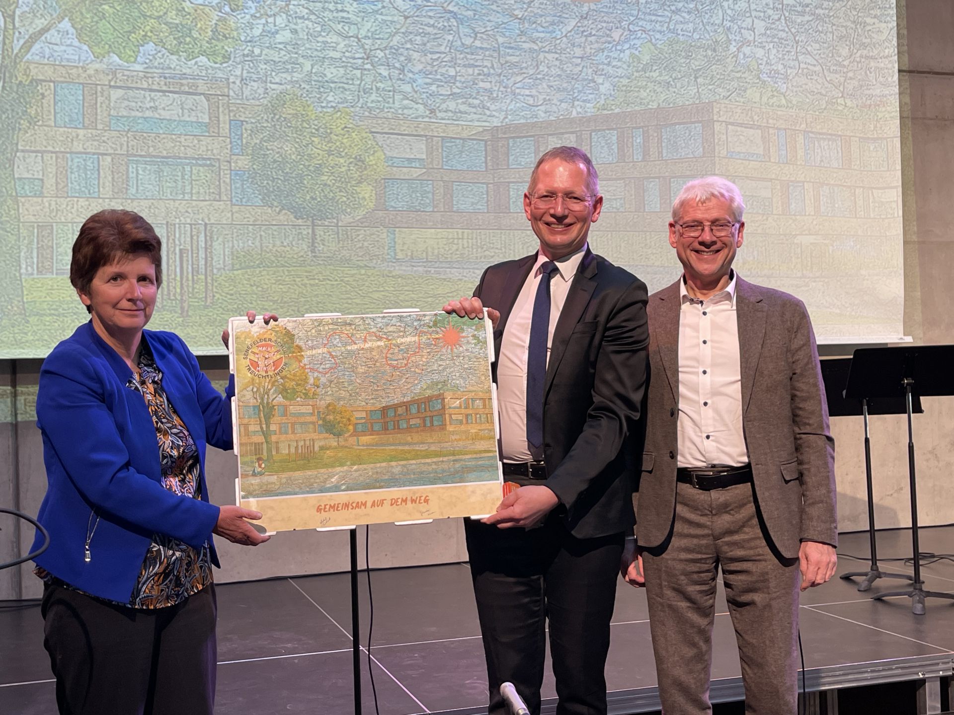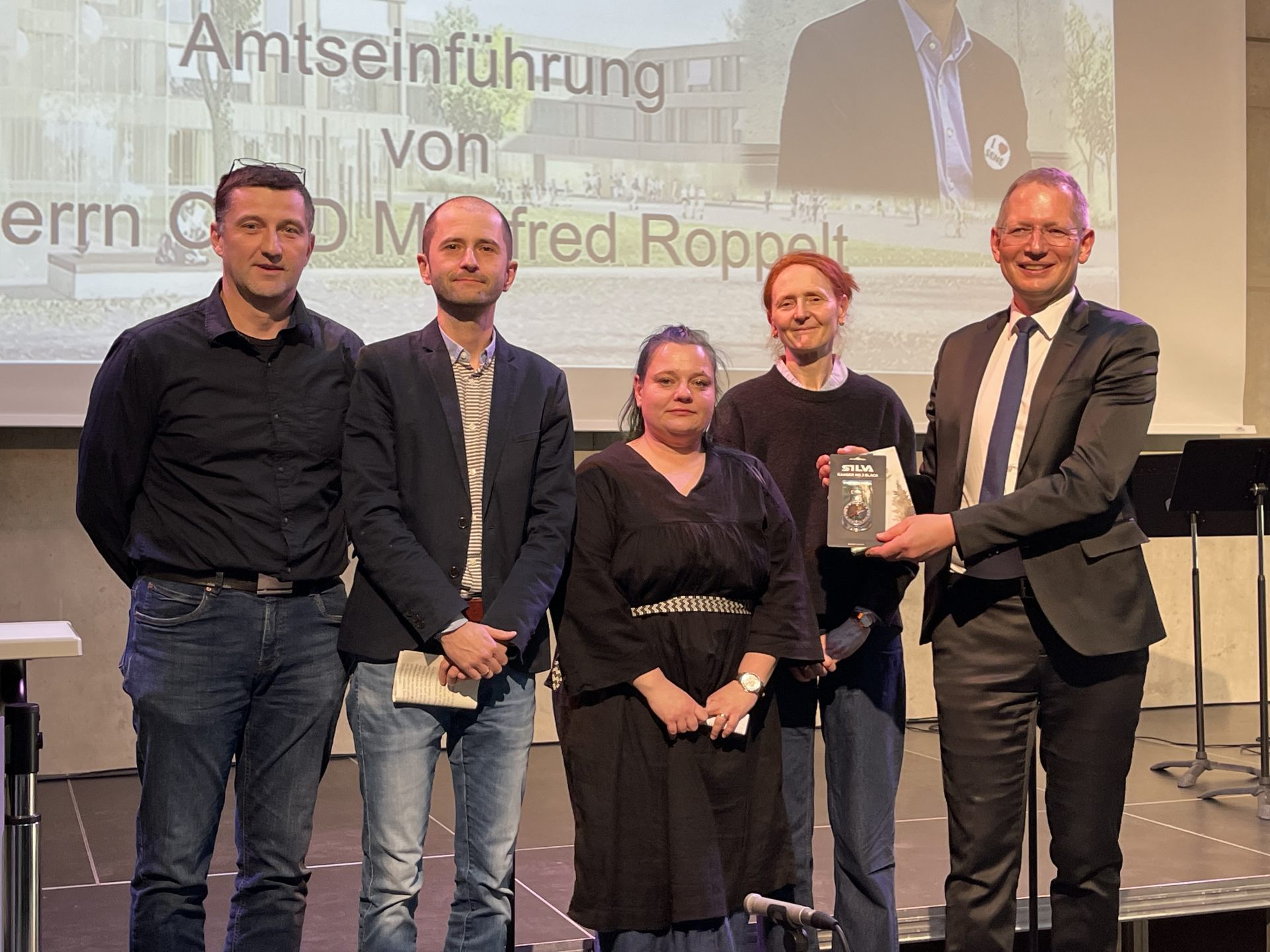 Dafür versammelten sich in der Aula des Neubaus neben der Familie des Schulleiters u.a. ehemalige und aktuelle Kollegen, der Vorsitzende des Zweckverbandes Landrat Manuel Westphal, die Bürgermeister des Zweckverbandes, der Ministerialbeauftragte für die Realschulen in Mittelfranken Michael Schmidt sowie die Ministerialbeauftragte für die Gymnasien in Mittelfranken Dr. Gabriele Kuen. Diese skizzierte in ihrer Rede den Weg, den Herr Roppelt als Schulleiter vor sich hat. Dieser verlaufe nicht immer gerade, sondern schlage auch mal Umwege ein, bevor er ans Ziel führe.