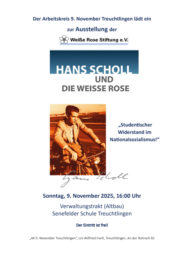 Dazu lade ich dich bzw. Sie herzlich ein, auch im Namen von Wilfried Hartl vom Arbeitskreis, der über die Stiftung "Weiße Rose e.V." die Ausstellung nach Treuchtlingen geholt hat.
