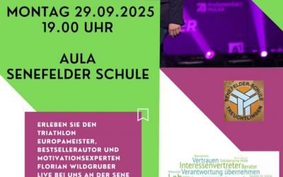 Ende September erlebten die Gäste eine ganz besondere Abendveranstaltung an unserer Schule. Auf Einladung des Elternbeirates und in Kooperation mit dem Förderverein sorgte Triathlon-Europameister und Bestsellerautor Florian Wildgruber mit seinem tiefgehenden, kurzweiligen Vortrag für viele lustige, aber auch berührende Momente. Die Aula war voll und auch zahlreiche Ehrengäste hatten sich eingefunden. Die Oberstufe und die SMV sorgten für das leibliche Wohl und auch unser Fair Trade Team brachte sich mit ein. Ein herzliches Dankeschön an Herrn Landrat Manuel Westphal für die Spende zugunsten der Schulgemeinschaft und allen, die zu diesem unvergesslichen Erlebnis beigetragen haben, vor allem natürlich den zahlreichen Besuchern.